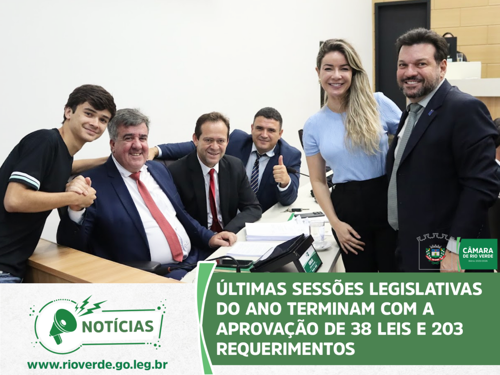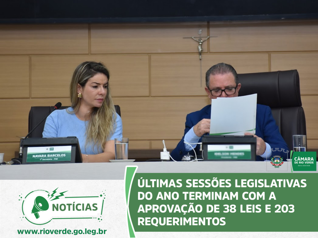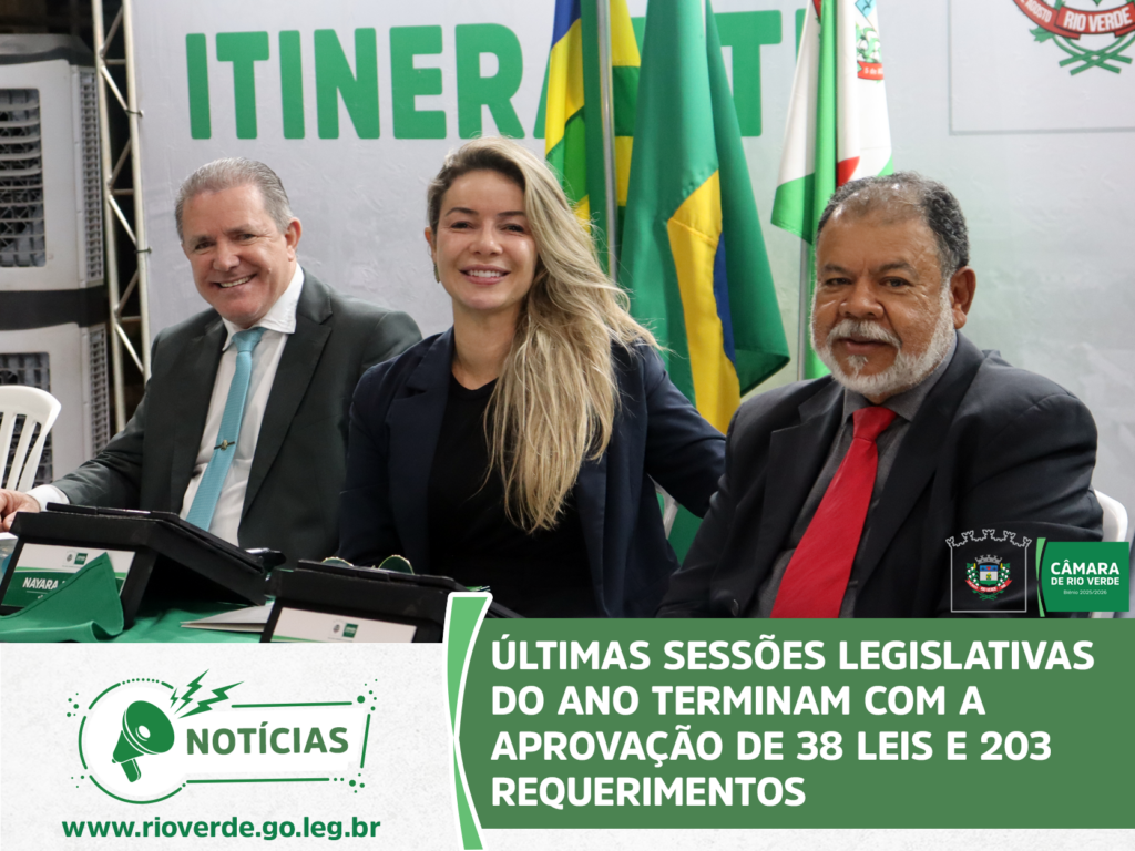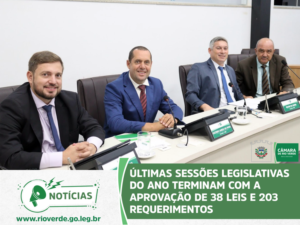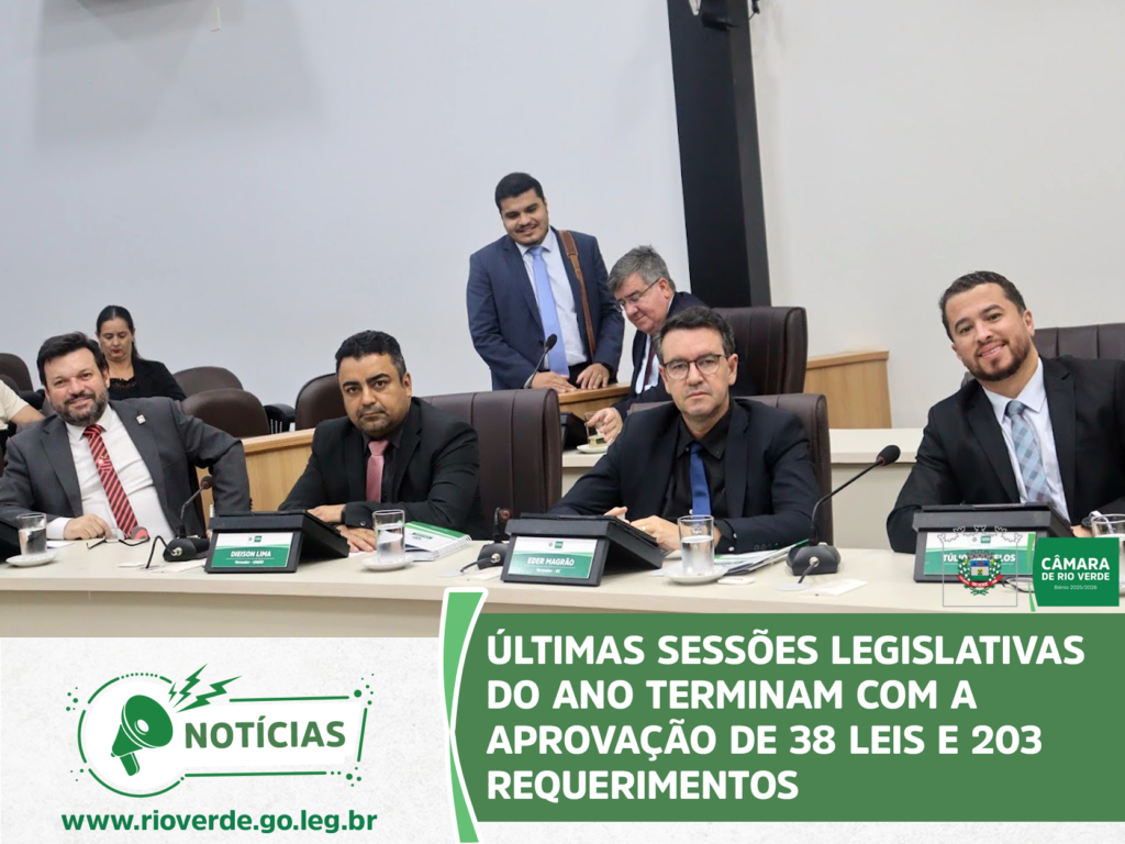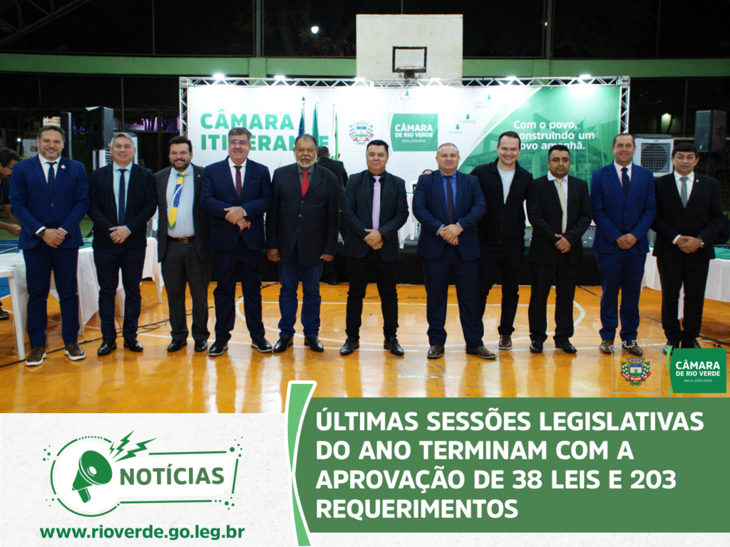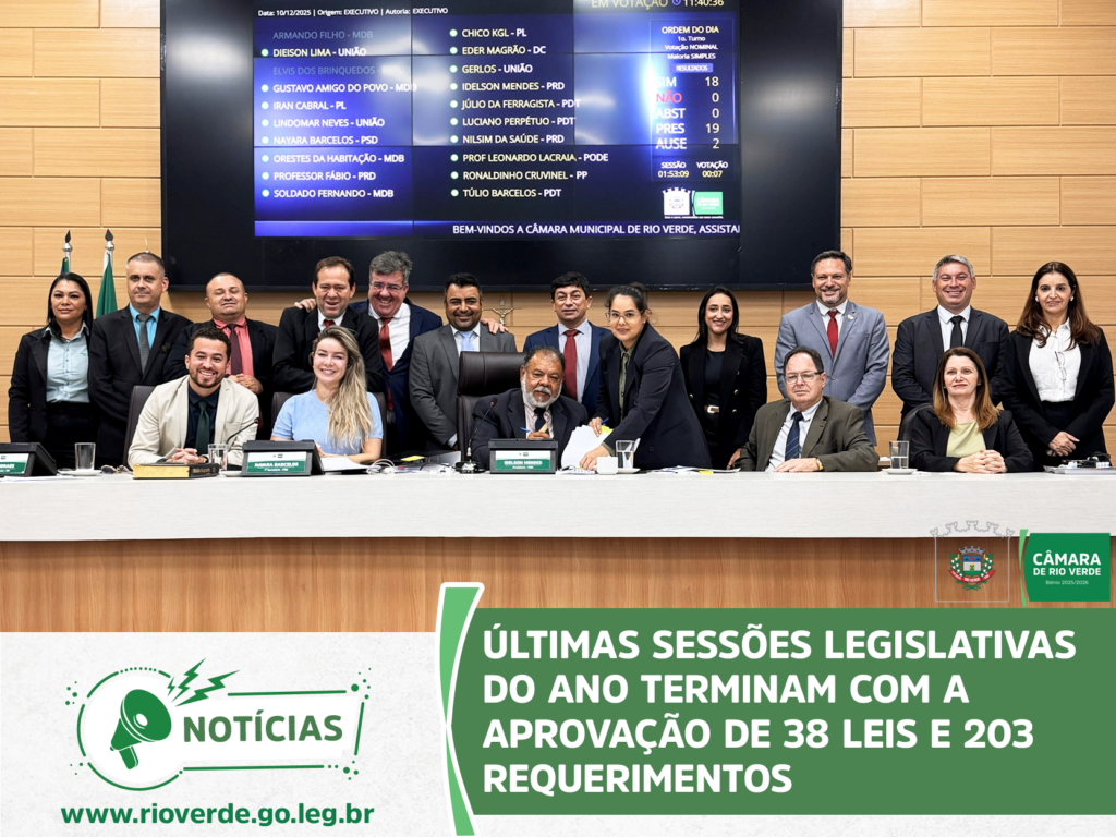 Ao final da sessão, o presidente Idelson Mendes agradeceu aos parlamentares e servidores da Casa pelo ano de muito trabalho, desejou à população rio-verdense um Feliz Natal e um Próspero Ano Novo e convidou todos para a próxima sessão ordinária, que abrirá os trabalhos de 2026 e será realizada no dia 9 de fevereiro, às 19 horas, no Plenário da Câmara Municipal.