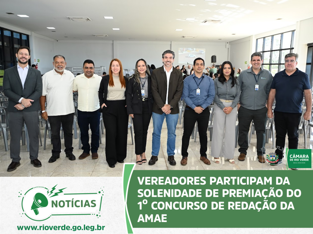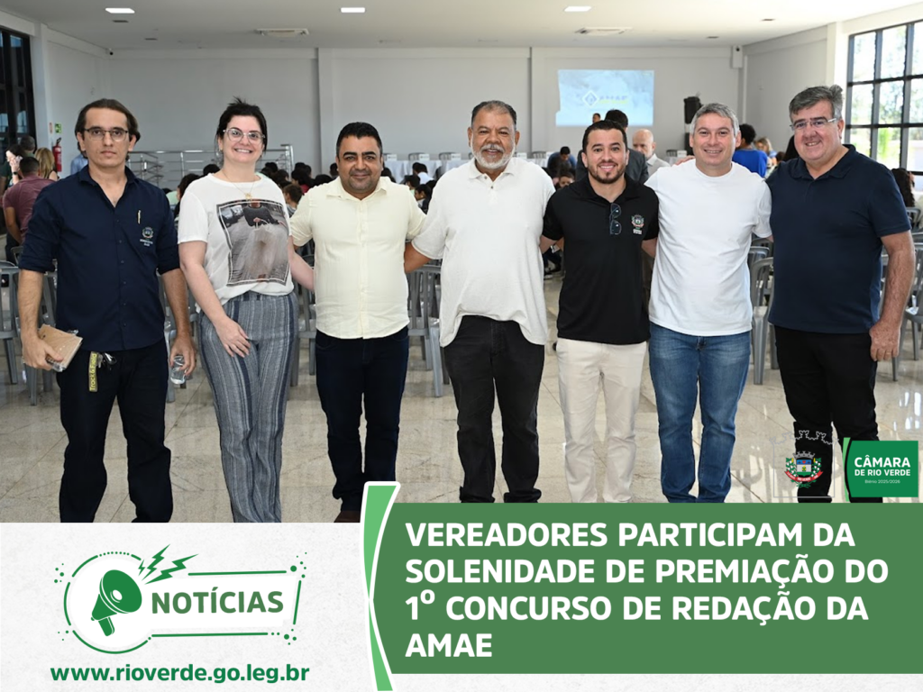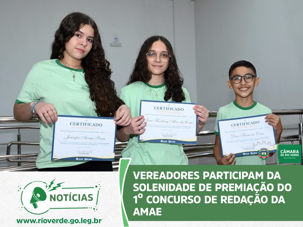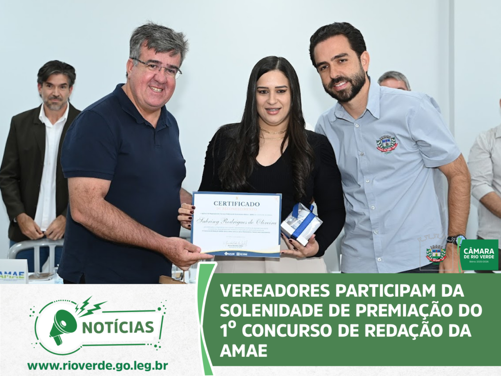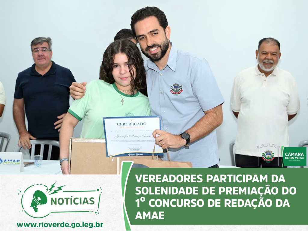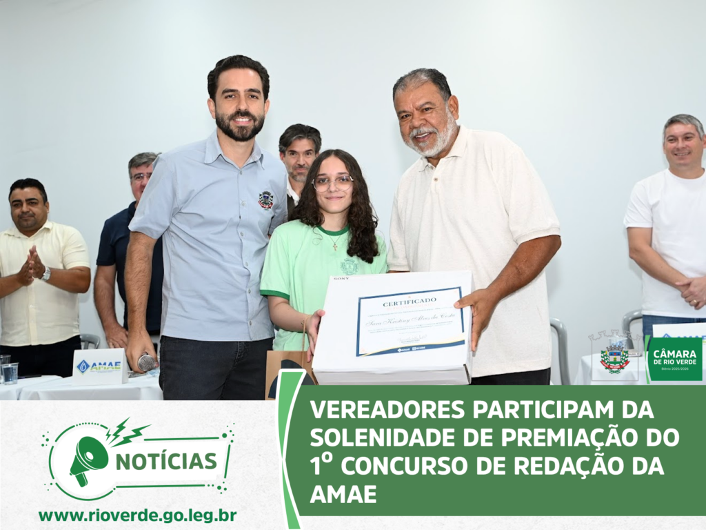A Câmara Municipal de Rio Verde marcou presença na solenidade de premiação do 1º Concurso de Redação da AMAE, realizada na manhã desta quarta-feira, 19 de novembro, no auditório do Paço Municipal. O evento celebrou o encerramento da iniciativa “Gota a Gota, Letra a Letra – Escrevendo o Futuro com Saneamento”, que envolveu alunos do 7º ano de quatro escolas da rede municipal.